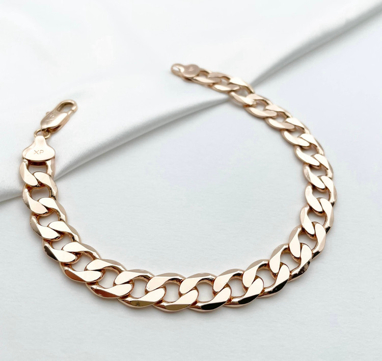 طراحی زنجیر پهن و یکدست باعث میشود دستبند جلوهای چشمگیر روی مچ دست داشته باشد، بدون اینکه شلوغ یا اغراقآمیز به نظر برسد. سطح صیقلی و براق زنجیر، نور را به زیبایی بازتاب میدهد و حس لوکس بودن محصول را تقویت میکند.